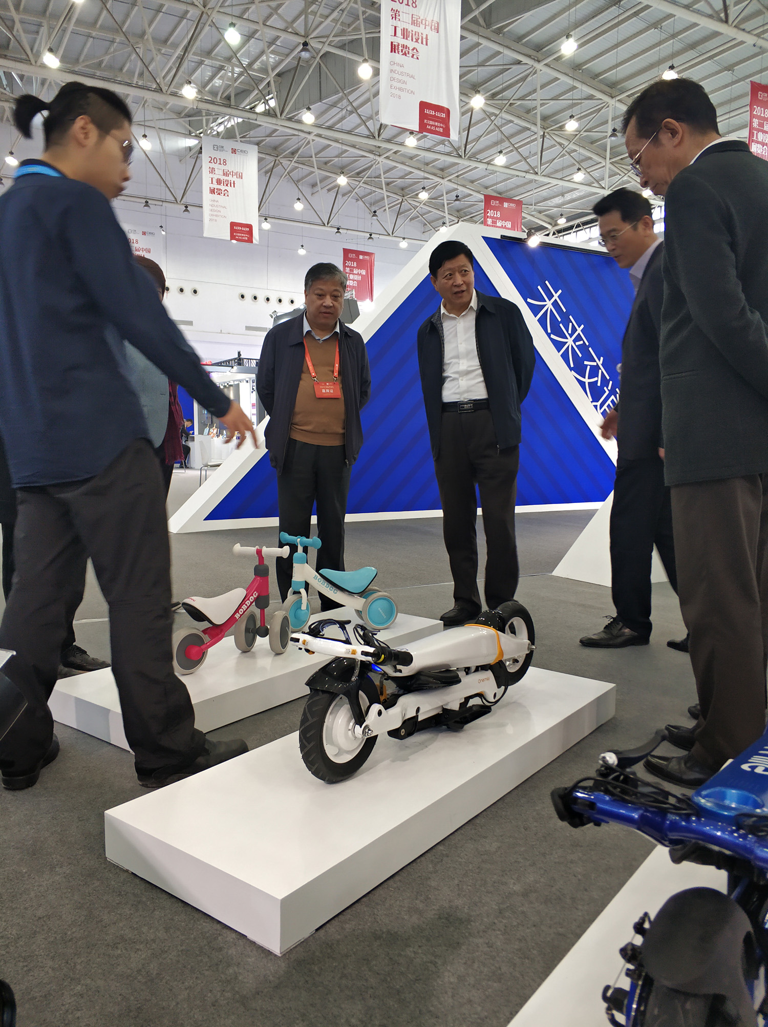 岸峰設(shè)計(jì)師為領(lǐng)導(dǎo)們講解榮獲“紅點(diǎn)之星”大獎(jiǎng)的光環(huán)電動(dòng)折疊車(chē)