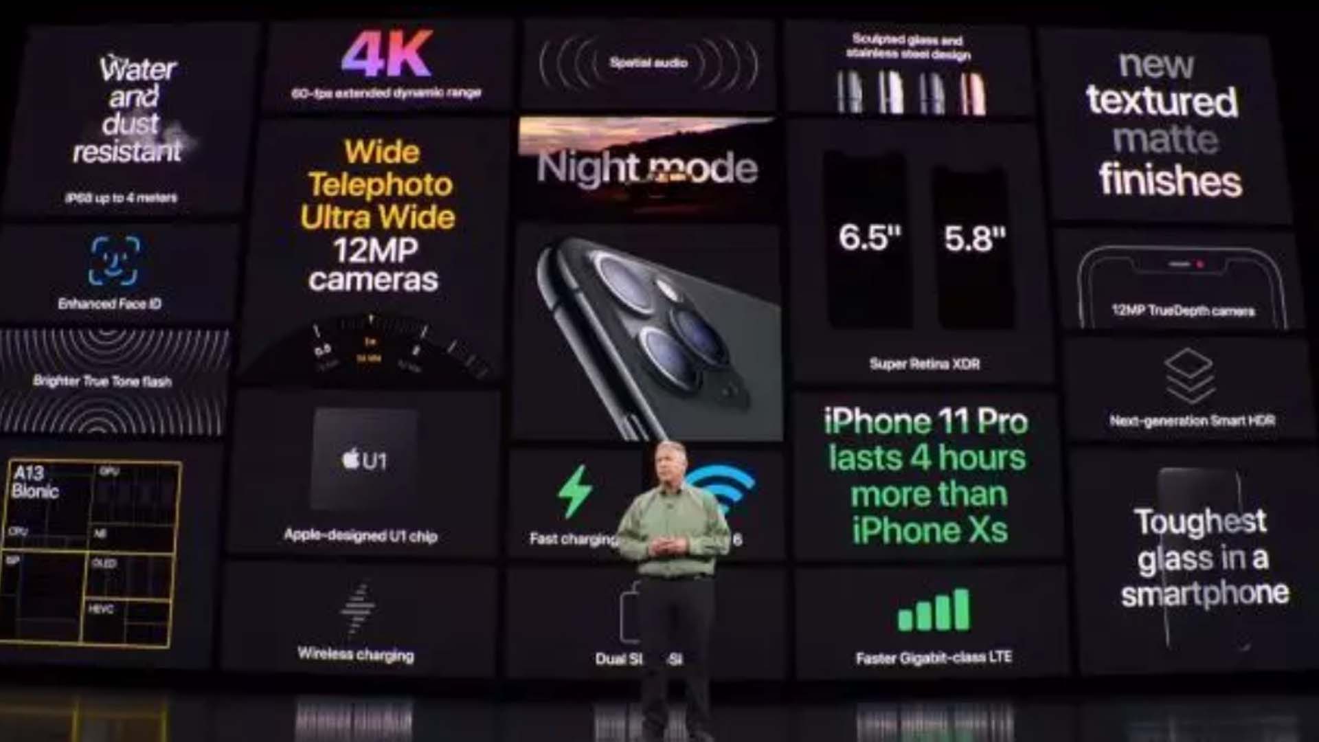 兩個(gè)版本iPhone 11 Pro和iPhone 11 Pro Max,4款顏色銀白色、金色、深空灰、暗夜綠,全新顯示屏,1200尼特。